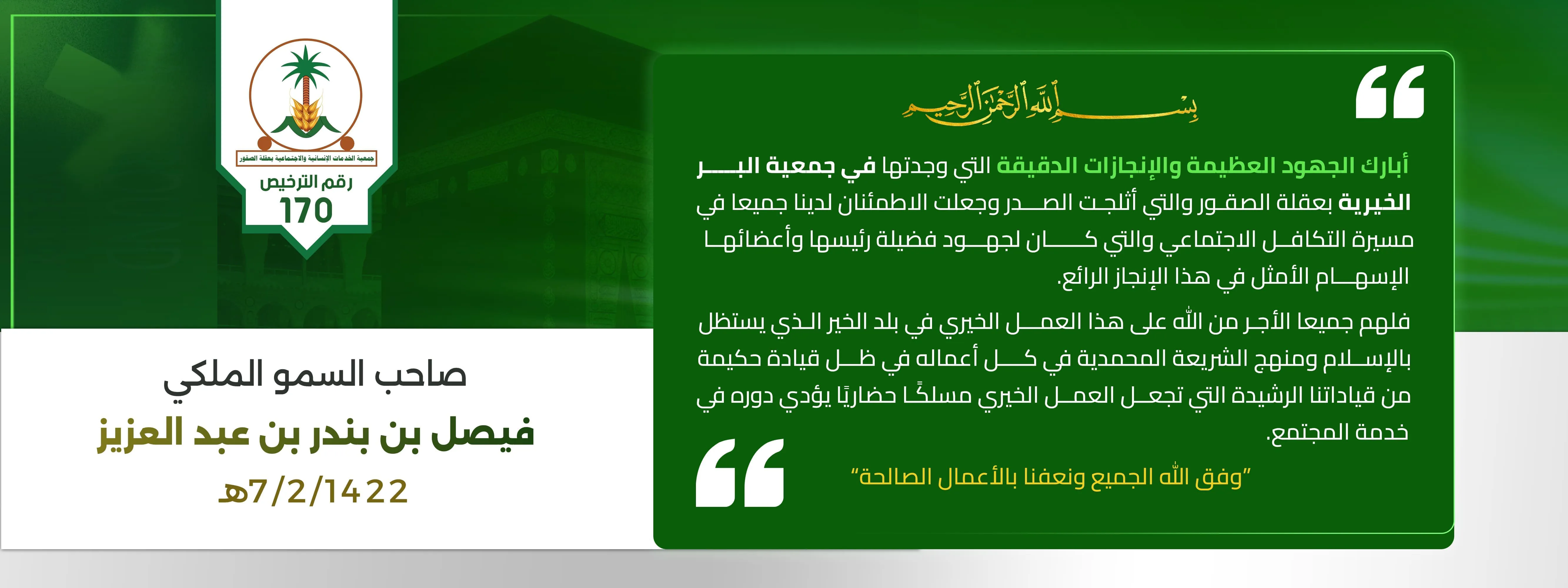 أبارك الجهود العظيمة والإنجازات الدقيقة التي وجدتها في جمعية البر الخيرية بعقلة الصقور والتي أثلجت الصدر وجعلت الاطمئنان لدينا جميعا في مسيرة التكافل الاجتماعي والتي كان لجهود فضيلة رئيسها وأعضائها الإسهام الأمثل في هذا الإنجاز الرائع.